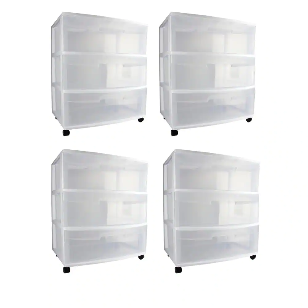 Sterilite 25.625 in. H x 15.25 in. W x 21.875 in. D Home 3 Drawer Wide Storage Cart Container with Casters (4-Pack)