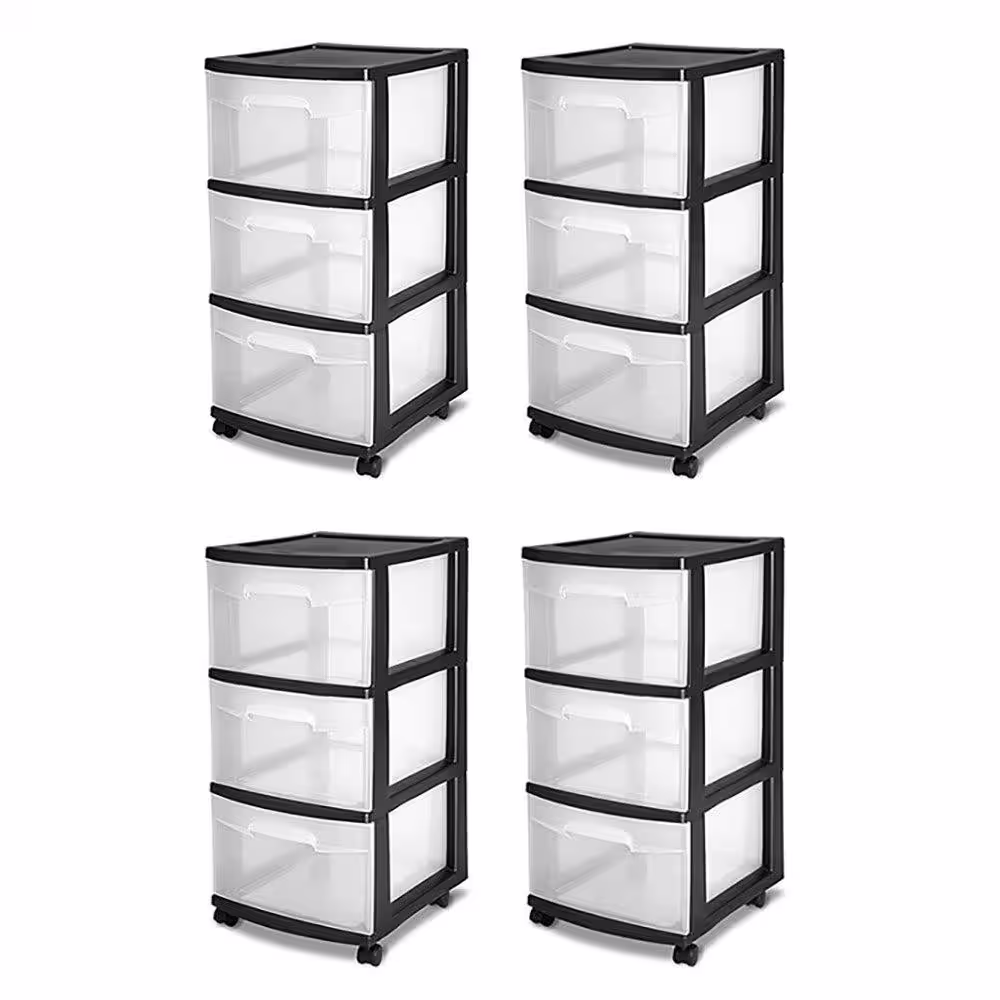 Sterilite 3-Drawer Storage Cart, Clear with Black Frame (4-Pack)