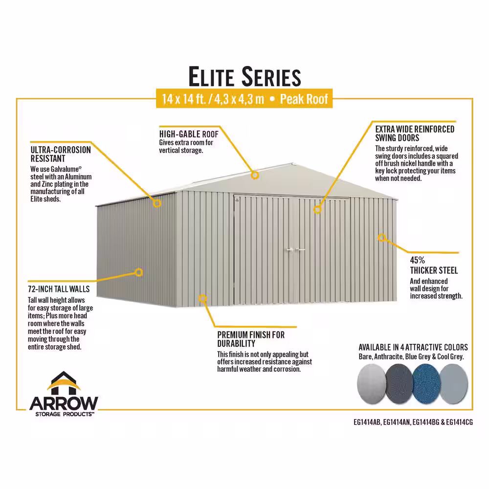 Arrow Elite Storage Shed 14 ft. W x 14 ft. D x 8 ft. H Metal Shed 196 sq. ft.