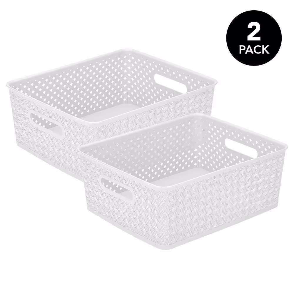 SIMPLIFY Medium 3 gal. Resin Wicker Storage Bin in White 2-Pack