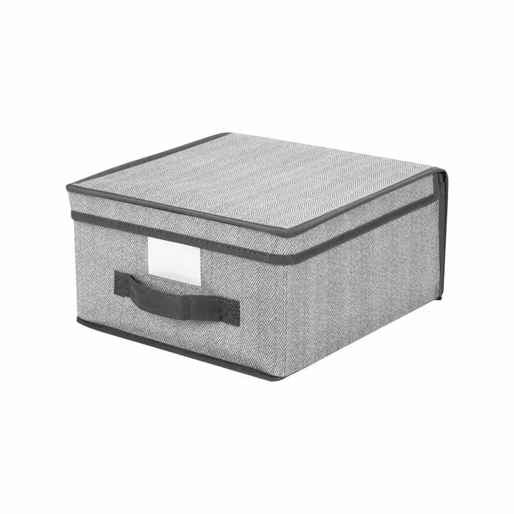 HOUSEHOLD ESSENTIALS 8 Qt. Saucer Storage Box, Holds 12 Saucers with Felt Protectors, Windowed Panel, 2 Riveted Handles in Gray