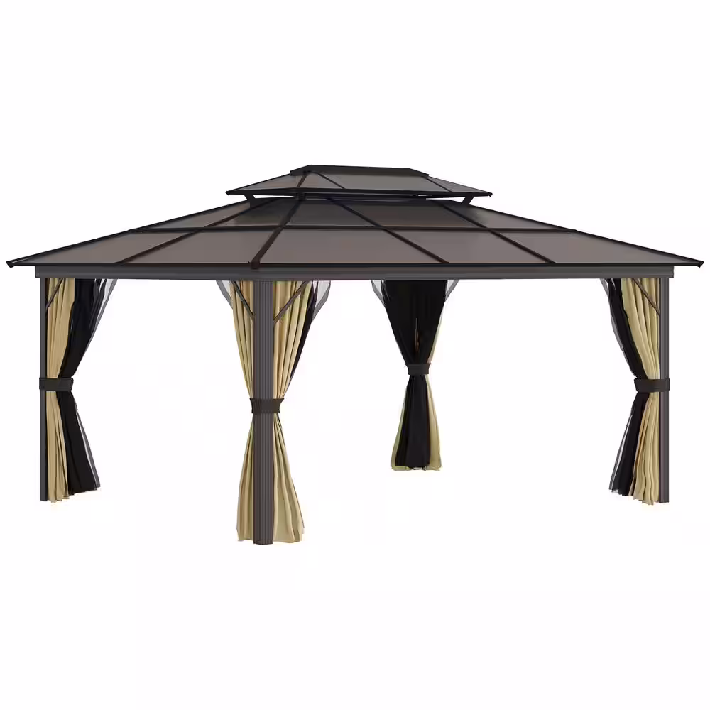 Outsunny 15 ft. x 11 ft. Beige Patio Gazebo with Hardtop Canopy, Double Vented Roof, Netting, Curtains