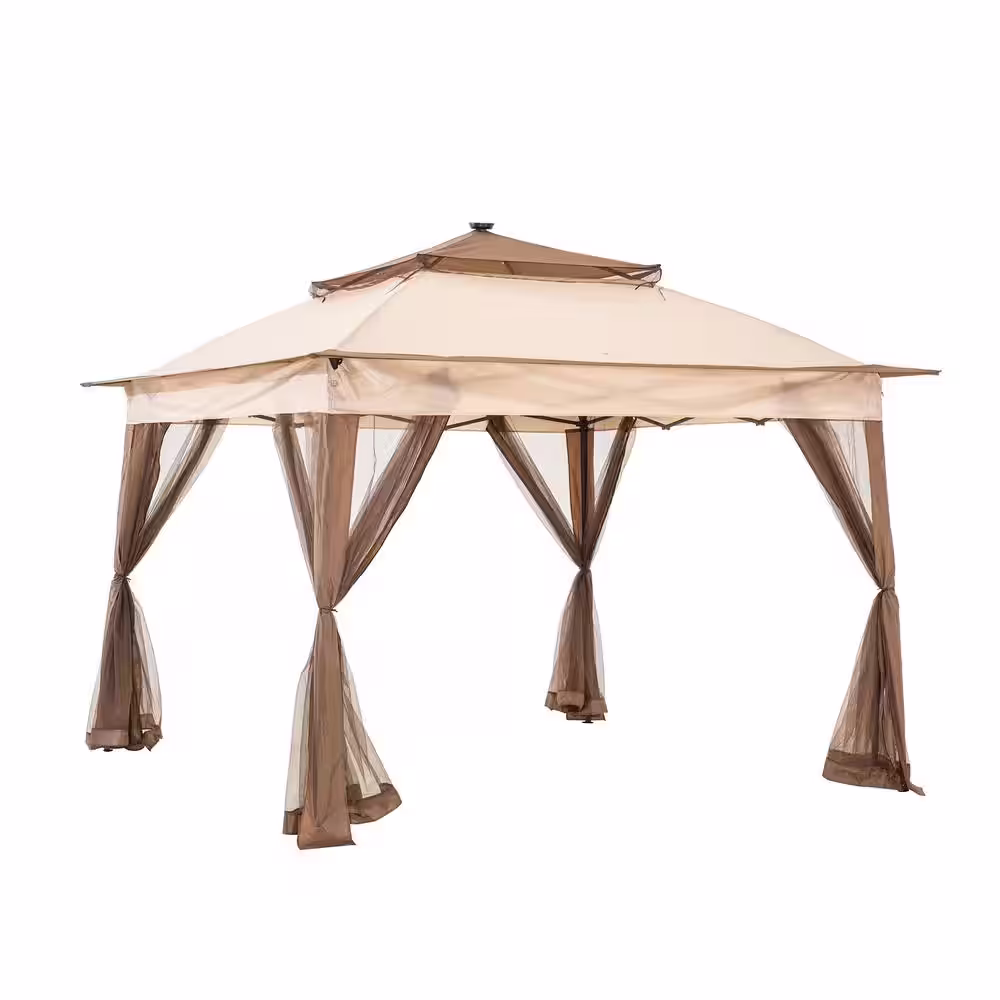Sunjoy Bourbon 13.5 ft. x 13.5 ft. Brown Steel Gazebo with 2-Tier Tan and Brown Dome Canopy and Mosquito Netting