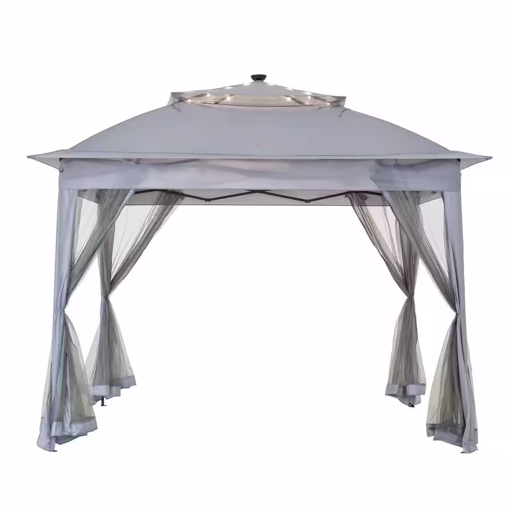 Sunjoy 11 ft. x 11 ft. Grey Patio Pop Up Portable Steel Gazebo with Solar LED Lighting
