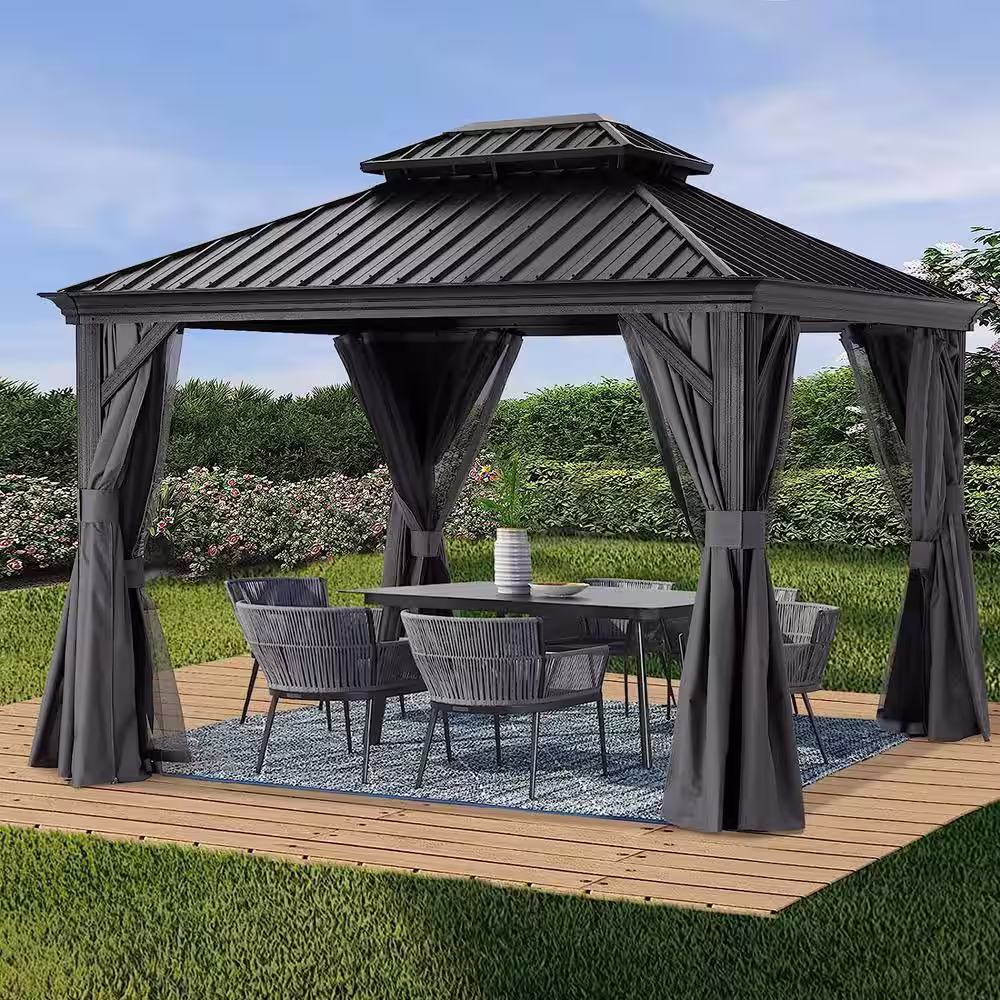 ABCCANOPY 10 ft. x 12 ft. Gray Hardtop Patio Gazebo Galvanized Steel Double Roof Aluminum Pavilion with Netting and Curtain