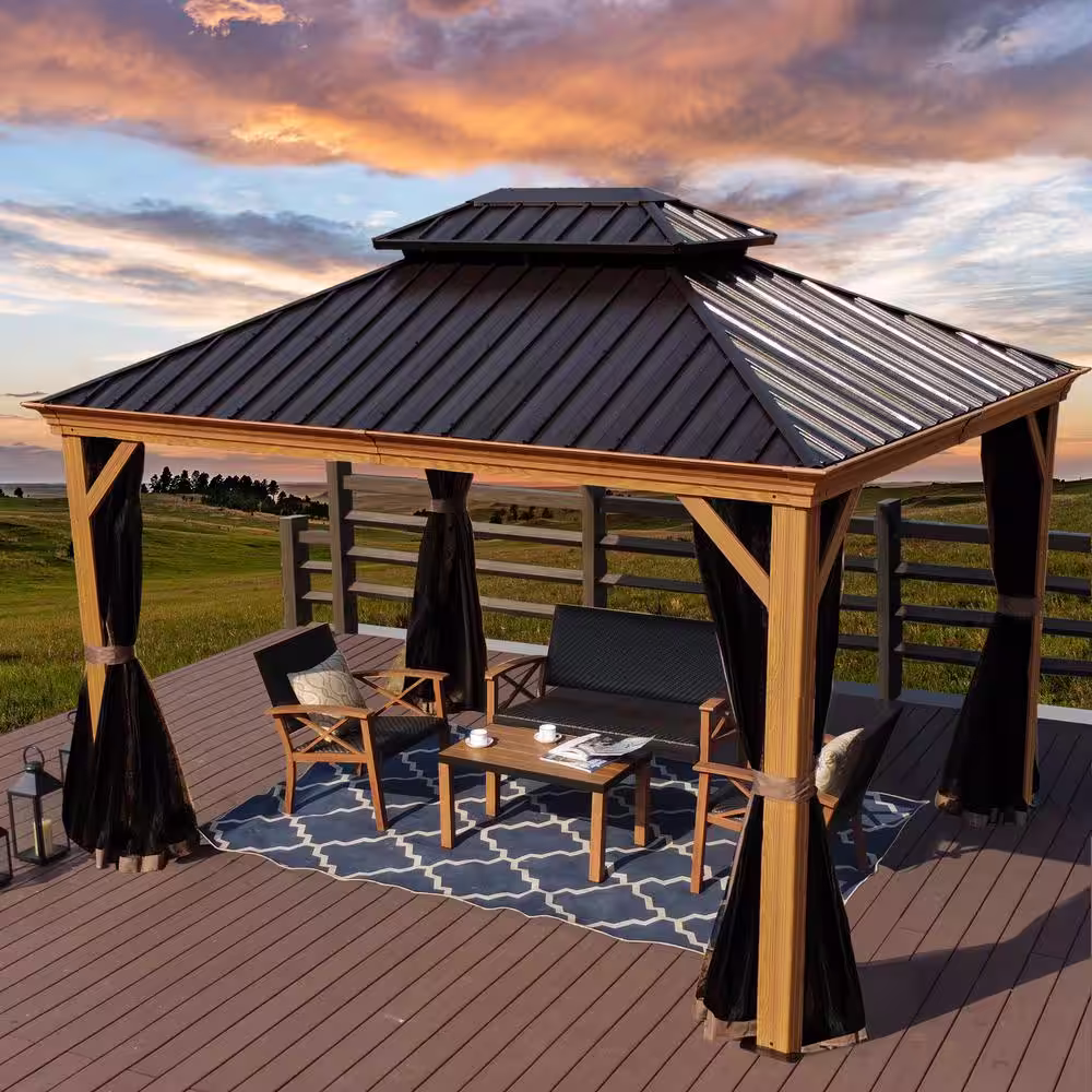 None 15 ft. x 13 ft. Wood Grain Aluminum Double Galvanized Steel Roof Gazebo with Ceiling Hook, Mosquito Netting and Curtains