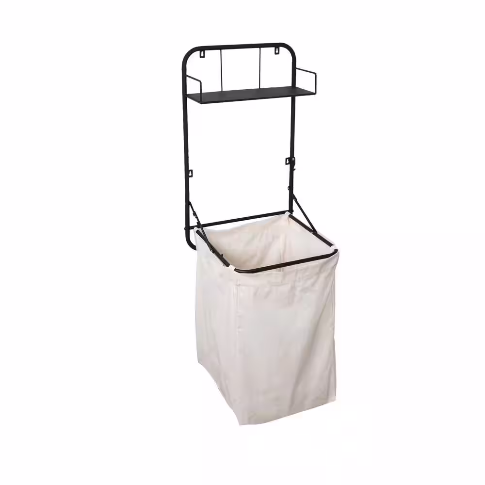 Honey-Can-Do 55 in. H x 18 in. W Collapsible Wall-Mounted Clothes Hamper with Canvas Laundry Bag and Wood Shelf, Black/Natural