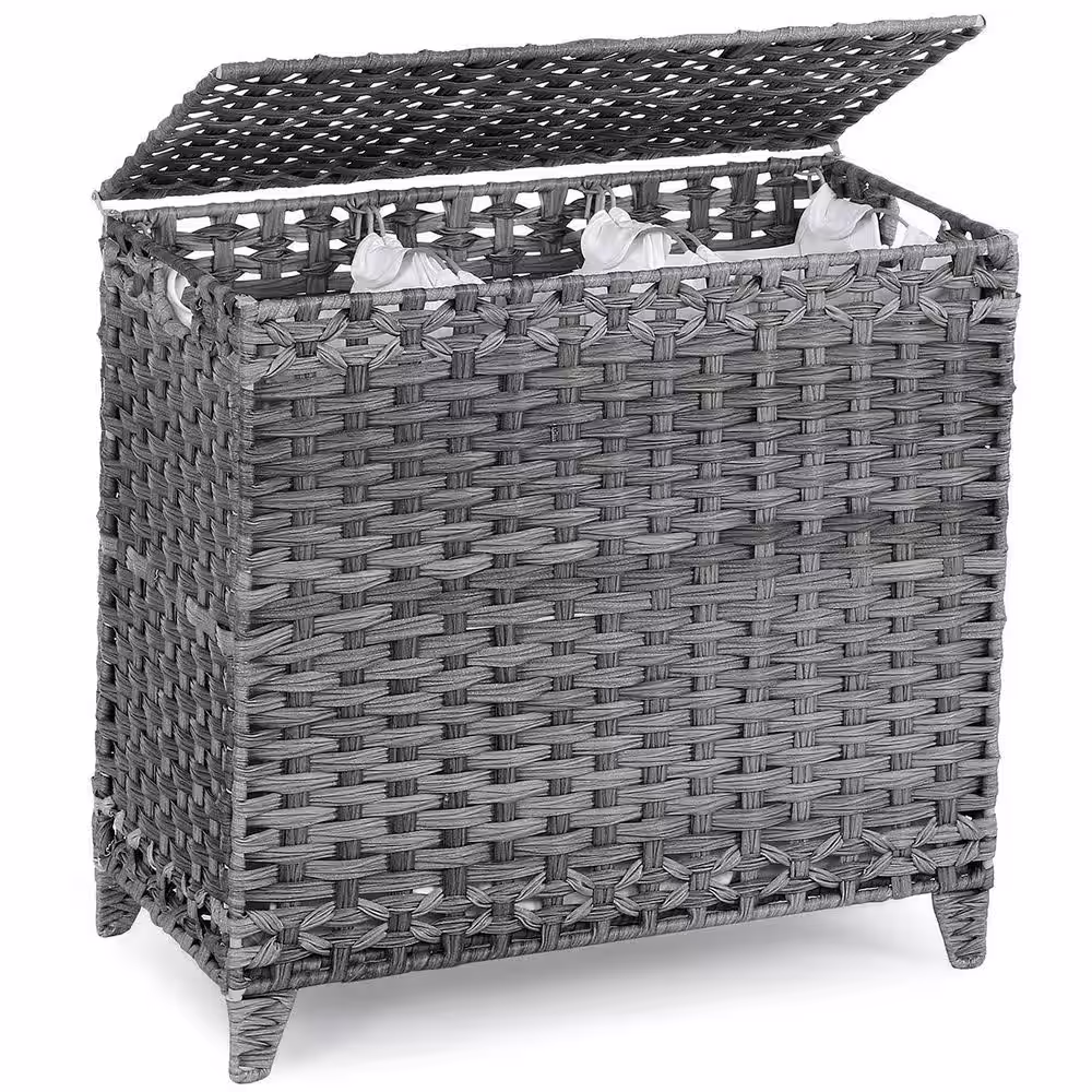 None 132 L Plastic Rattan Laundry Basket Hamper with Lid Gray