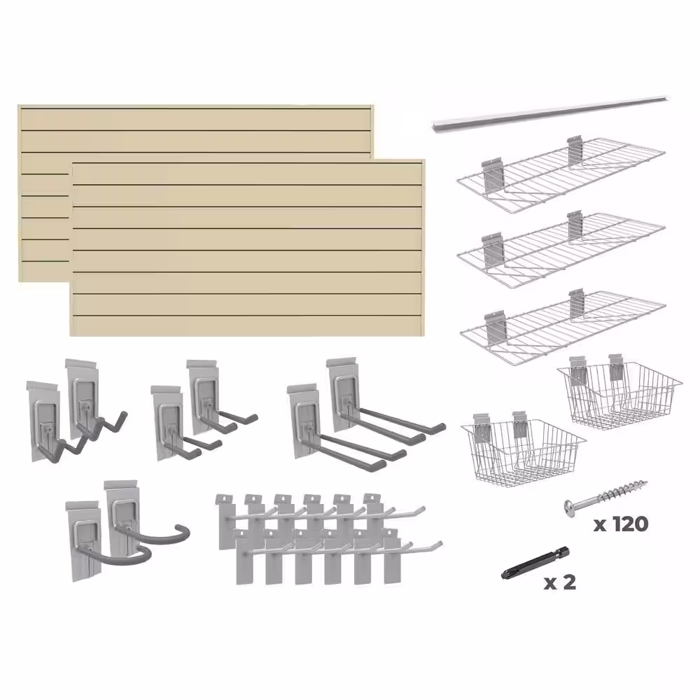 CROWNWALL Super Bundle 48 in. H x 96 in. W Slatwall Kit in Sandstone PVC 64 sq. ft. with 25-Piece Accessory Kit
