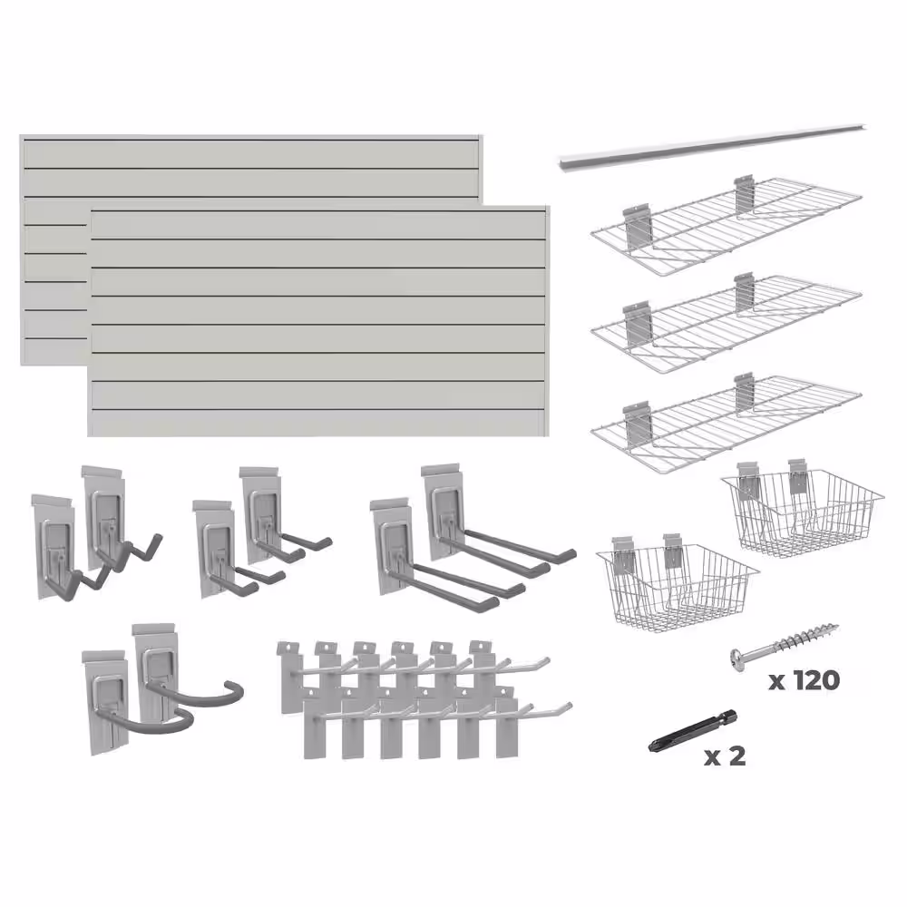 CROWNWALL Super Bundle 48 in. H x 96 in. W Slatwall Kit in Graphite PVC 64 sq. ft. with 25-Piece Accessory Kit