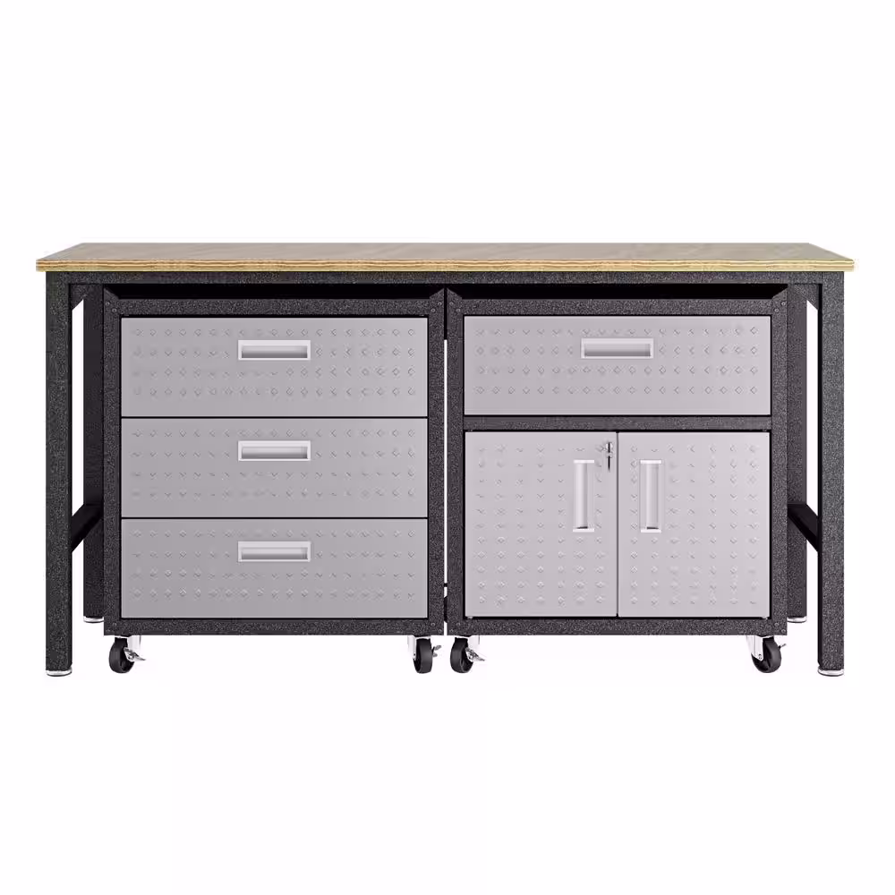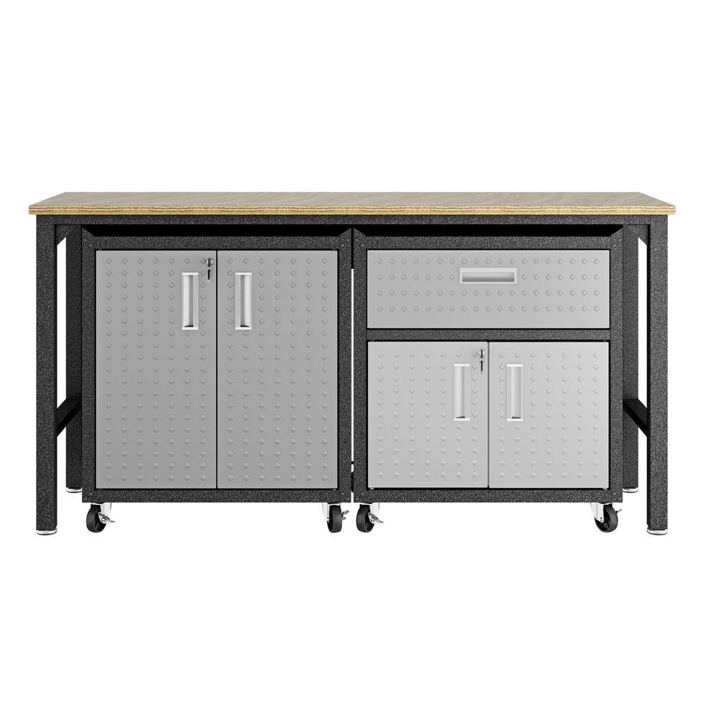 Manhattan Comfort Fortress 37.6 in. H x 72.4 in. W x 20.5 in. D Mobile Space-Saving Steel Garage Cabinet and Worktable in Grey (3-Piece)