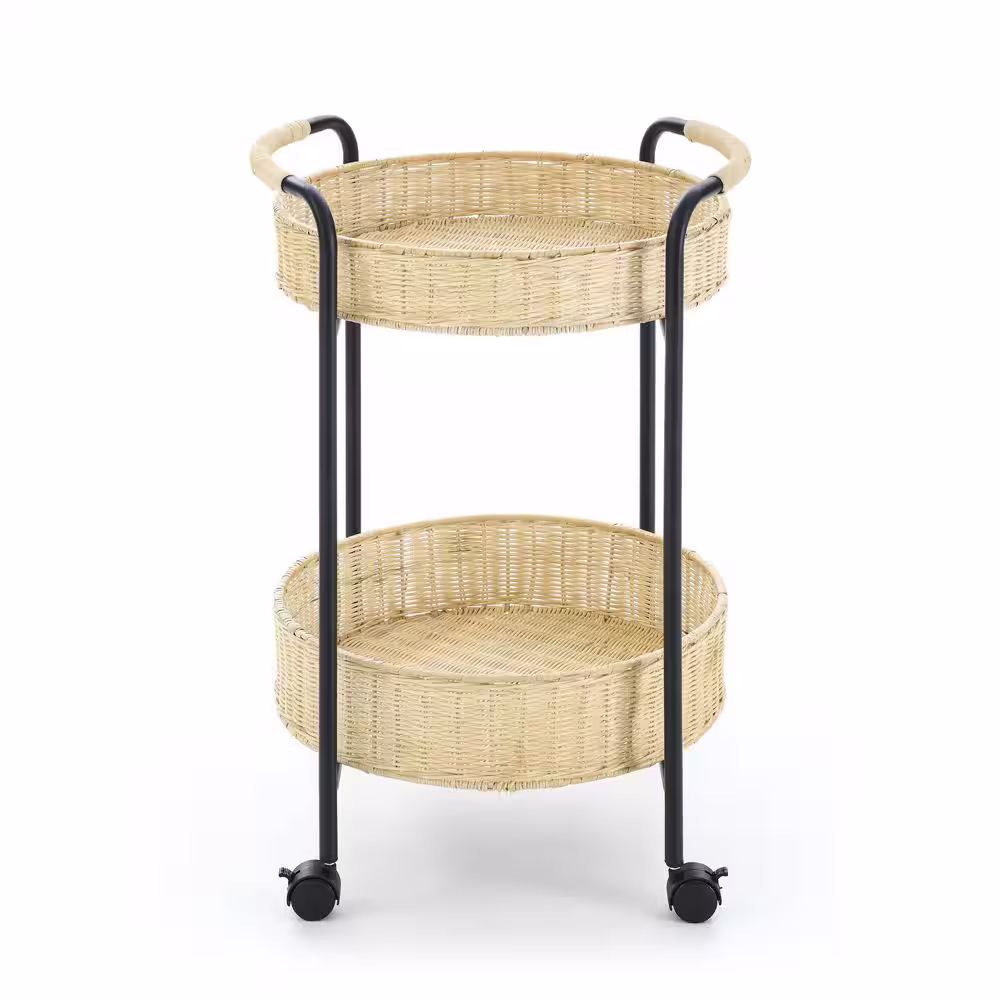 None 2-Teir Rattan Basket Storage shelves with Black Stoving Steel Frame
