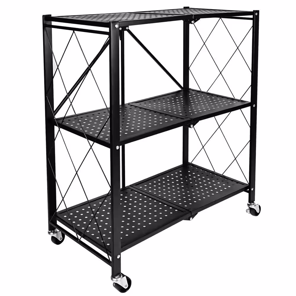 Amucolo Black Heavy Duty 3-Tier Foldable Metal Rack Storage Shelving Unit with Wheels(27.5 in. W x 31 in. H x 13.5 in. D)