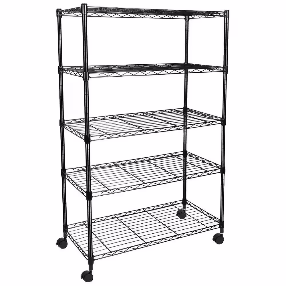 None Black 5-Tier Rolling Heavy Duty Steel Wire Freestanding Garage Storage Shelving Unit (36 in. W x 62 in. H x 14 in. D)