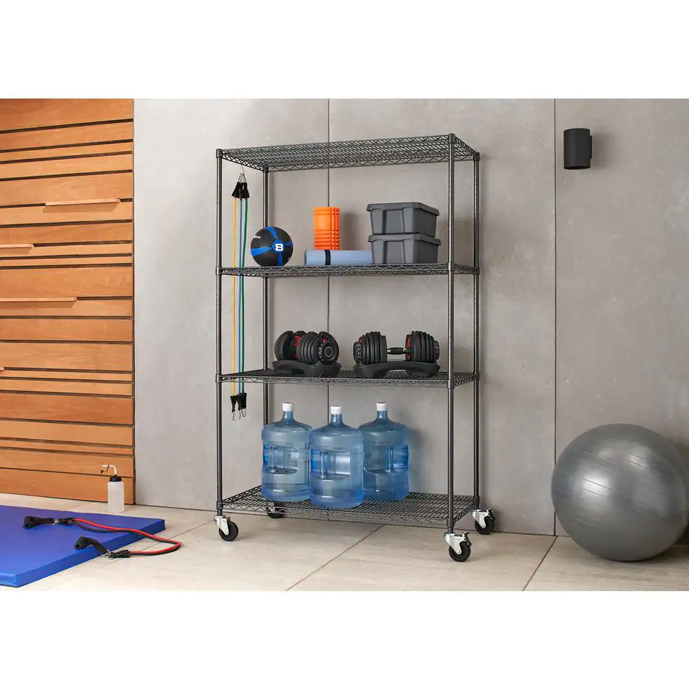 TRINITY PRO Black 4-Tier Rolling Steel Wire Garage Storage Shelving Unit (48 in. W x 77 in. H x 24 in. D)