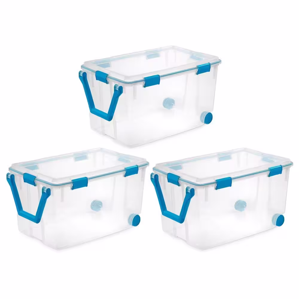 Sterilite 120 Qt. Plastic Storage Tote with Blue Aquarium Gasket Latch Lid in Clear (3-Pack)