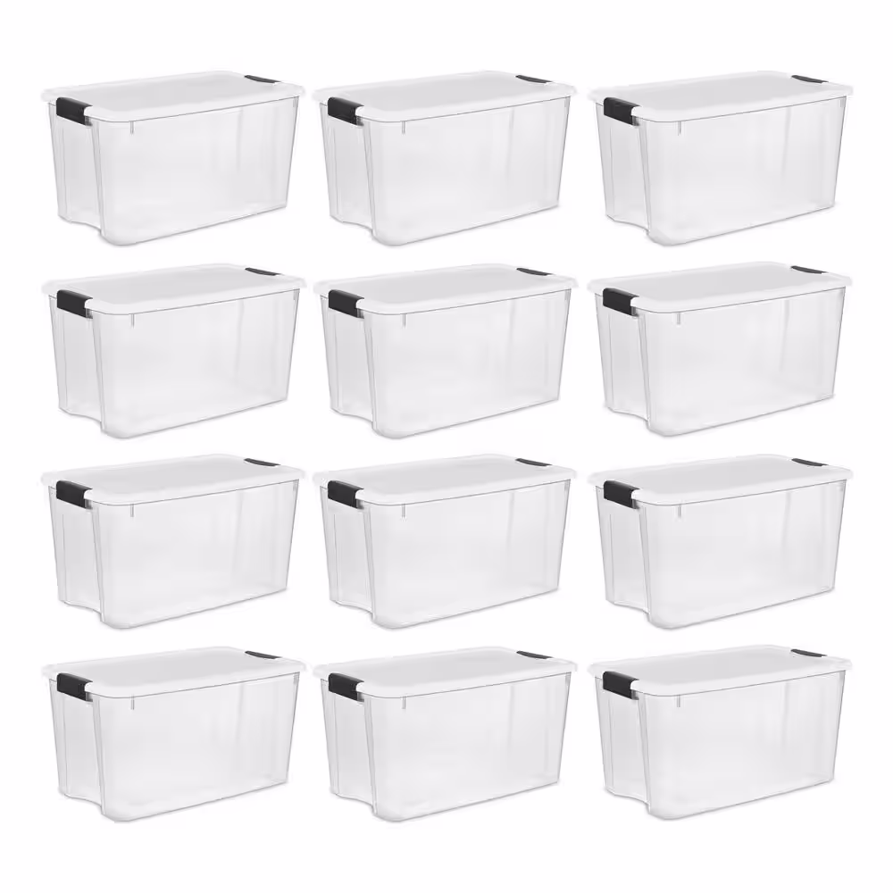 Sterilite 70 Qt. Plastic Stacking Storage Box in White Lid and Clear Base with Black Latches (12-Pack)