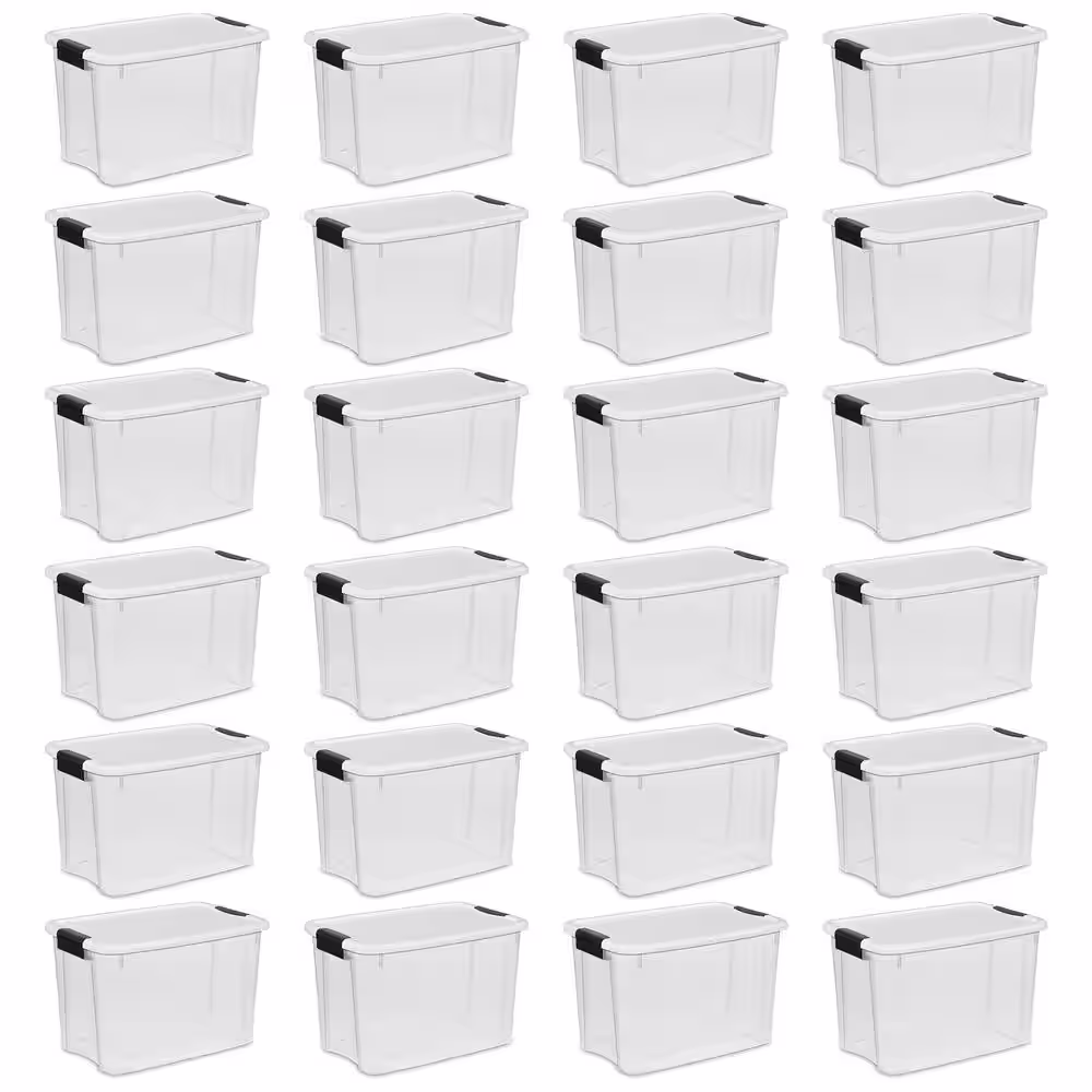 Sterilite 30 qt. Clear Plastic Stackable Storage Bin w/White Latch Lid, (24-Pack)