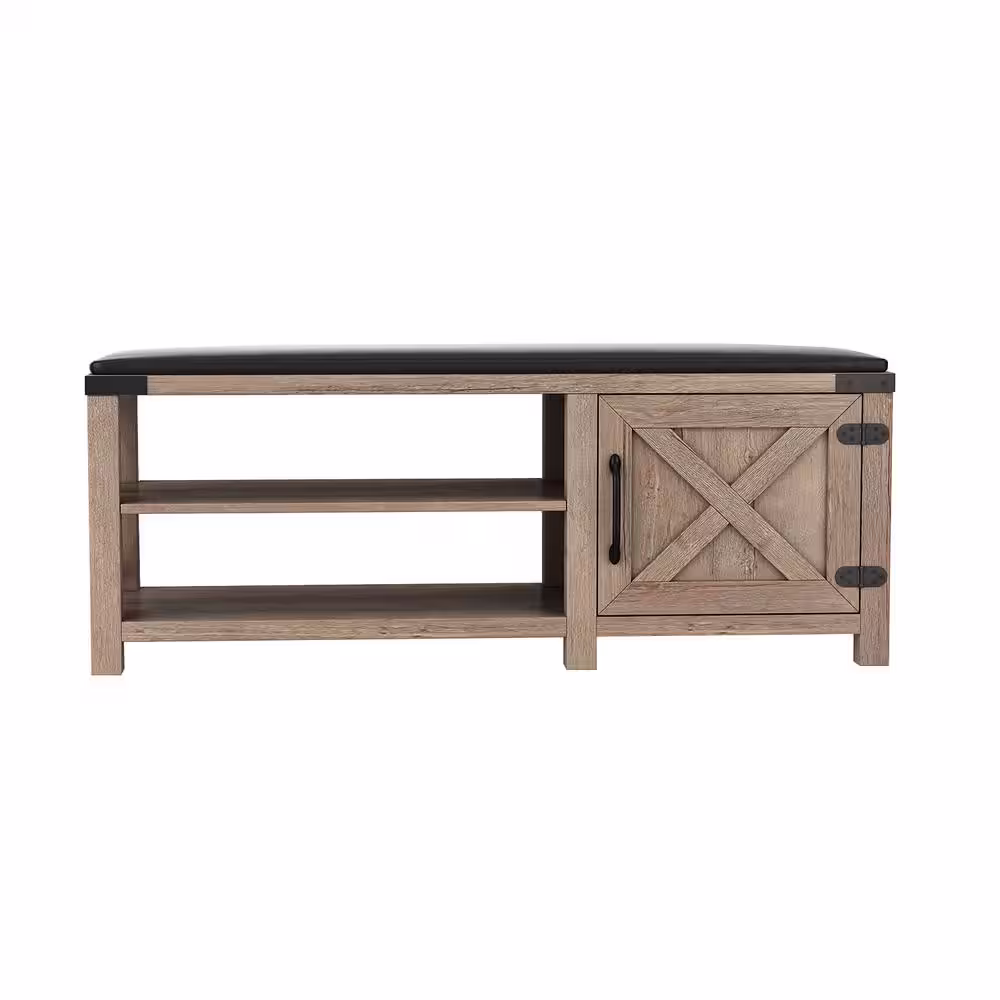 None Modern Farmhouse 18.5 in. H x 47.24 in. W Light Brown Shoe Storage Bench, Tobacco Wood, With Seat Cushion