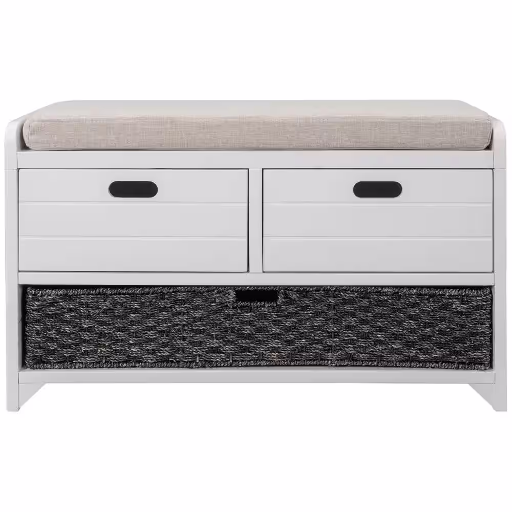 aisword Storage Bench White with Removable Basket and 2-Drawers, Fully Assembled Shoe Bench with Removable Cushion