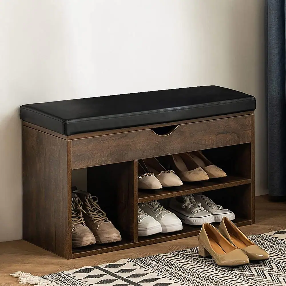 None 17 in. H 5-Pair Brown Wood Shoe Rack Bench 3-Tier Storage Shelf