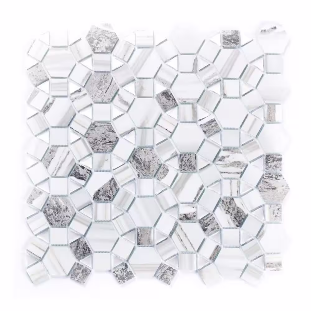 ABOLOS Art Deco White & Gray Cobblestone Mosaic 12 in. x 12 in. Wood Look Glass Decorative Wall Tile (10 sq. ft./Case)