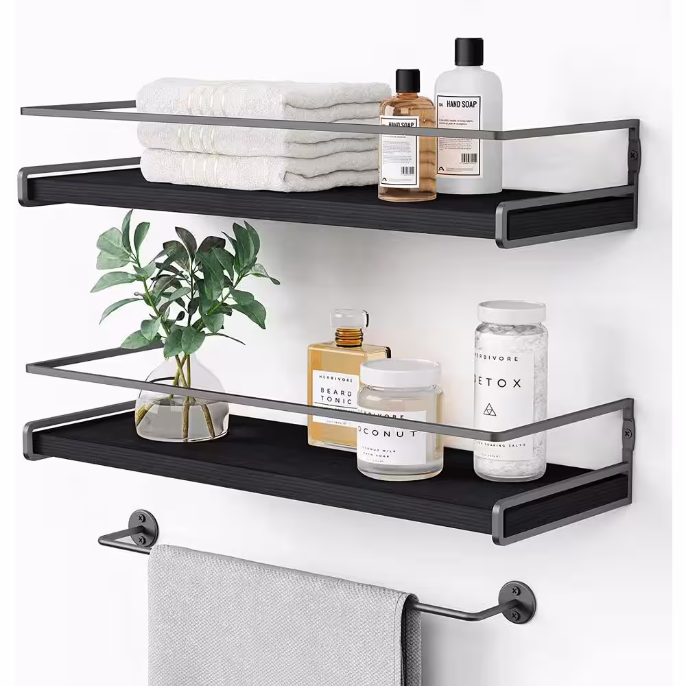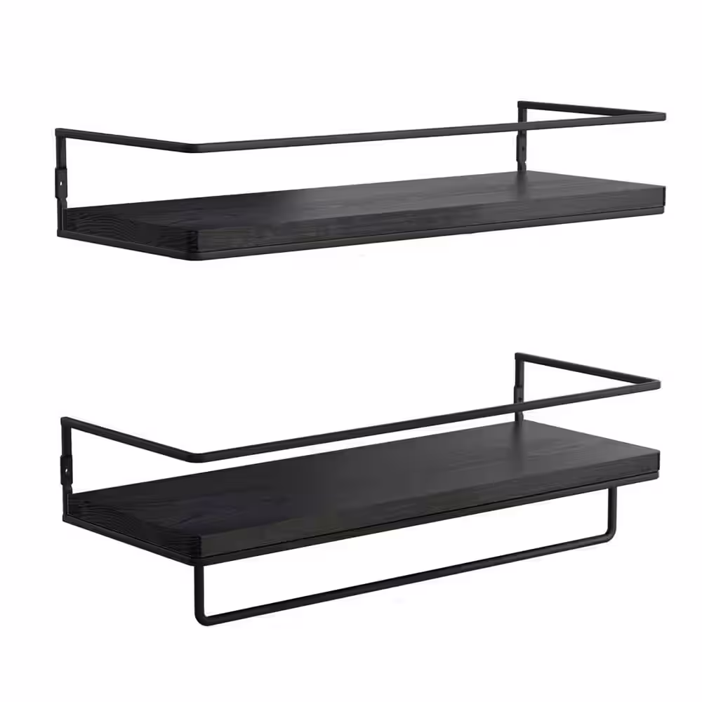 None 5.7 in. x 15.7 in. x 2.3 in. Black Wood Floating Decorative Wall Shelves with Metal Brackets and Towel Rack