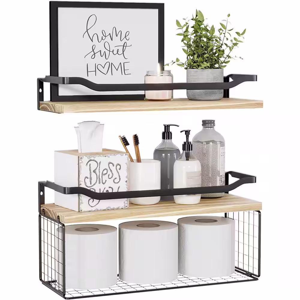 None 15.7 in. W x 6 in. D Light Brown Wood Decorative Wall Shelf, Floating Shelves with Wire Storage Basket