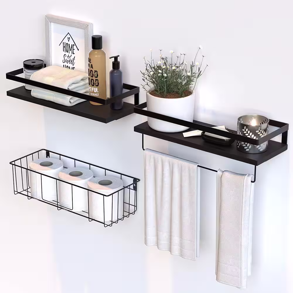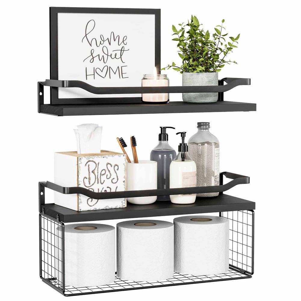 None 15.7 in. W x 5.7 in. D Black Wood Decorative Wall Shelf, Floating Shelves with Metal Basket Set
