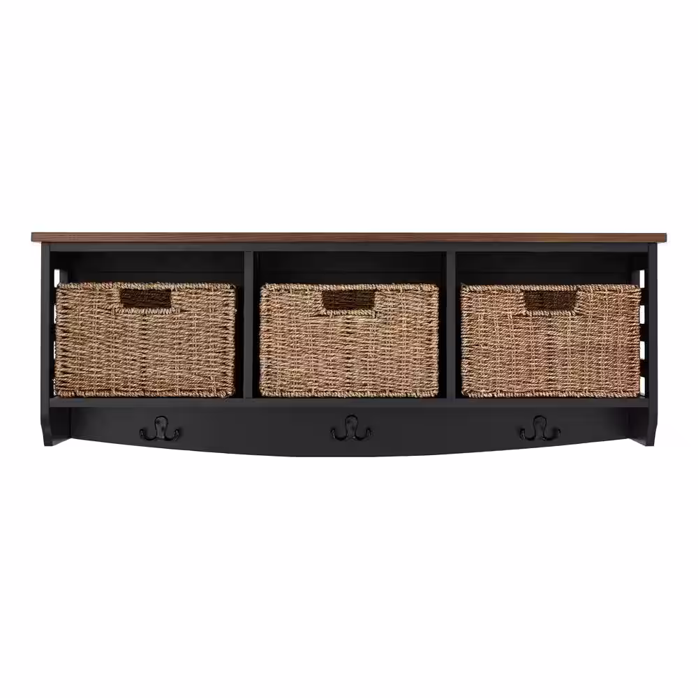 Home Decorators Collection 9.7 in. H x 40 in. W x 9.5 in. D Black and Walnut Wood Floating Decorative Cubby Wall Shelf with Hooks and Baskets