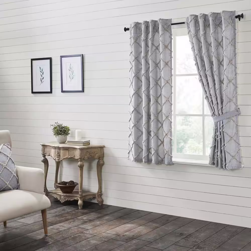 VHC Brands Frayed Lattice 36 in W x 63 in L Light Filtering Rod Pocket Window Panel Grey Creme Black Pair
