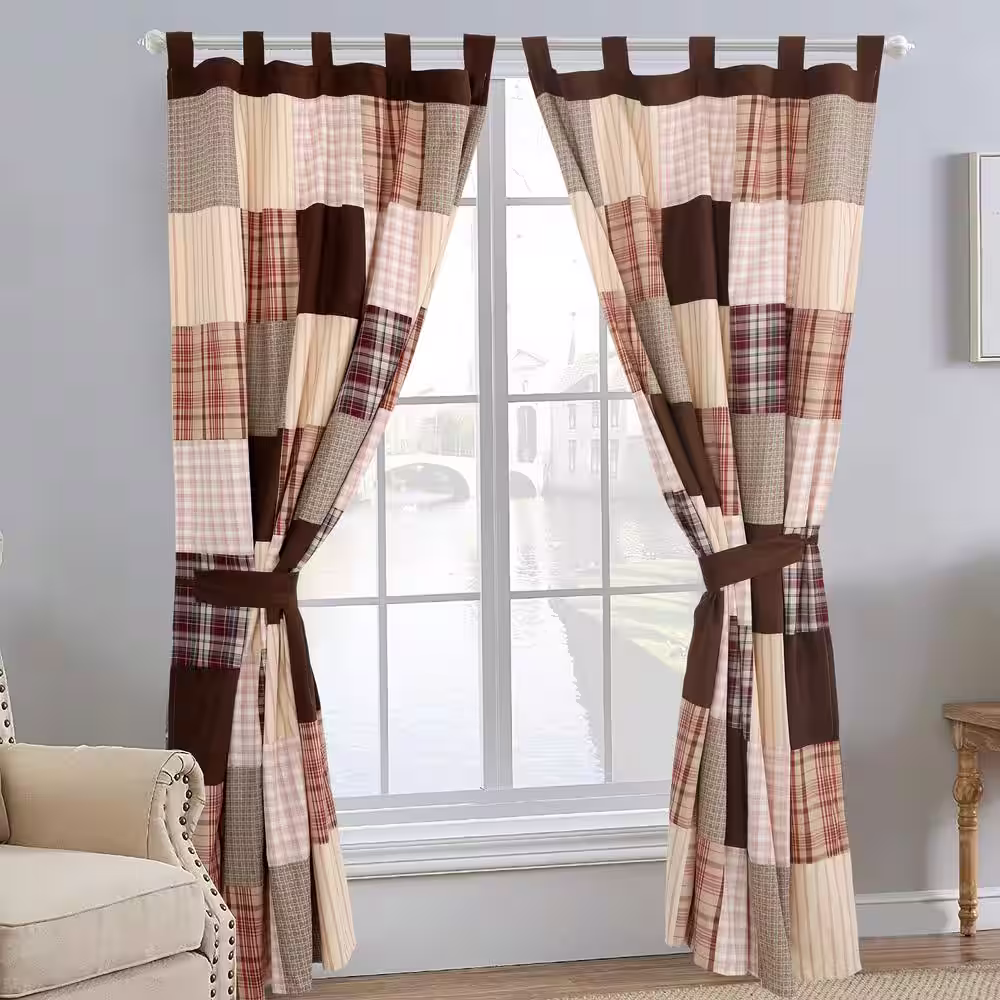 Cozy Line Home Fashions Brody Brown Plaid Stripe Patchwork Brown Rod Pocket Window Curtain Panel/Drapes (2 Piece) with Tie Backs